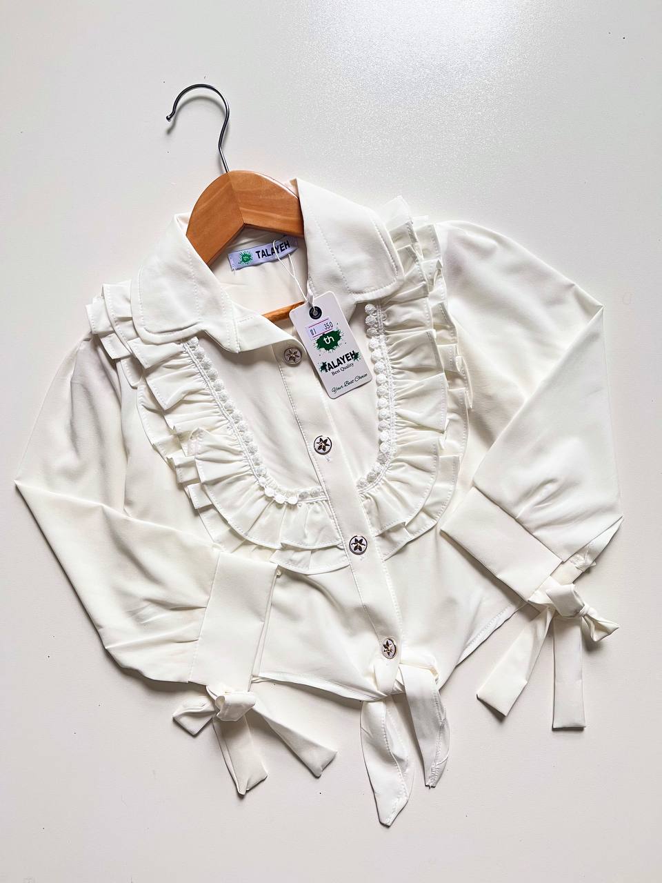 شومیز گره ای دخترانه سفید با جنس بوگاتی، طراحی شیک و لطیف مناسب کودکان 6 تا 9 سال برای استایل مجلسی و نیمهرسمی.